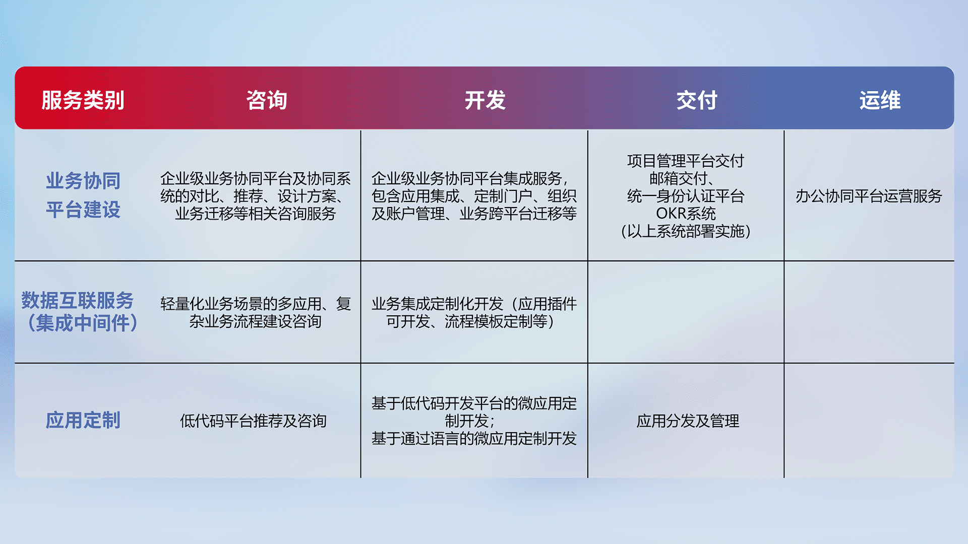 针对钉钉、、、企微、、IDaas等平台级产品提供产品的规划、、、方案、、、交付、、、、定制化开发等服务,,,实现如统一协同办公、、智能客户服务、、、混合会议管理、、、、智能数据查询、、等业务场景,,实现数字化转型。。。。
